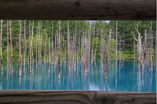 Macの壁紙に採用されたことでも有名な、美瑛の青い池。ターコイズブルーの水面から、立ち枯れた木々が伸びています。