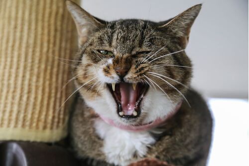 帯広の猫カフェ「Cat Cafe Wish」にいた猫ちゃん。悪い顔をしているけど、威嚇してるわけじゃなくてアクビの途中です。
